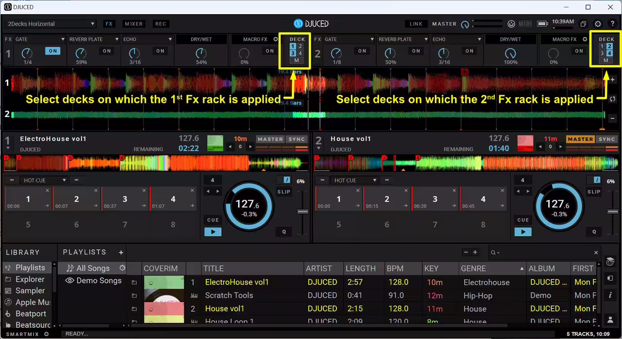 1) describe FX settings : to which deck(s) is applied the 2nd FX rack,